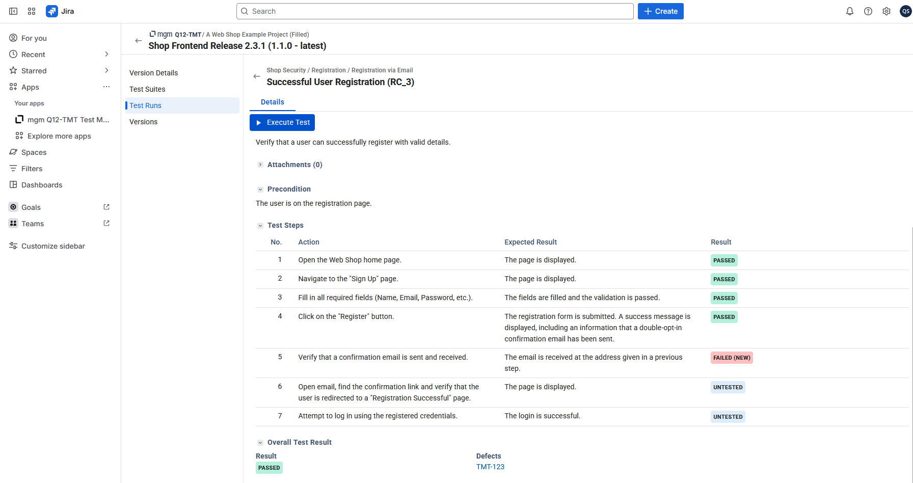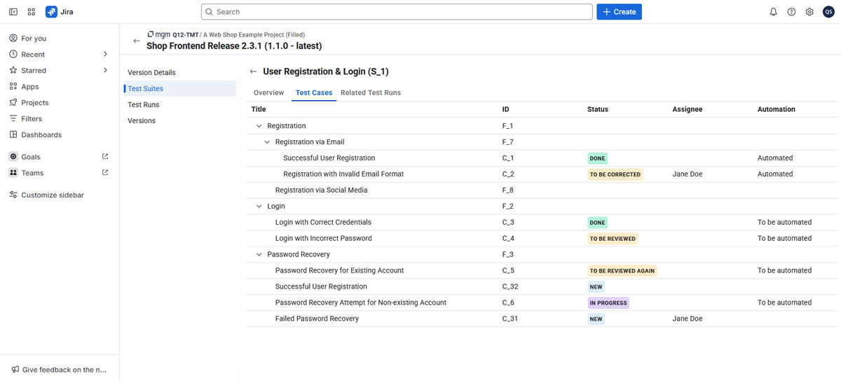 Q12-TMT can be used as a standalone web application or optionally integrated directly into Jira as an app. This makes key functions such as test case documentation, test automation status, and test execution available where teams already work—in Jira. Test cases, test runs, and test results can be managed efficiently, eliminating the need to switch between different tools.