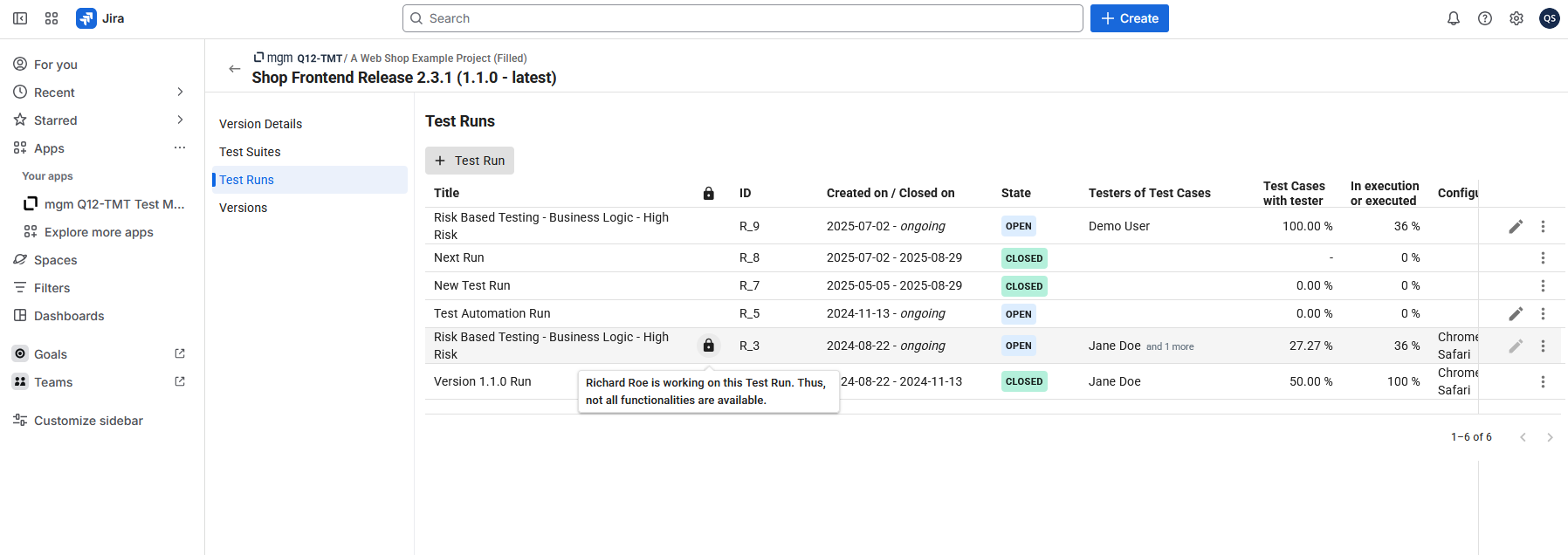 The Q12-TMT Jira Plugin supports collaborative editing of testing activities. Features such as edit locks, conflict warnings, and user assignments facilitate the coordination of parallel work and help prevent overlaps.